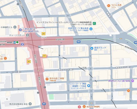 駅A5番出口至近、靖国通り、駿河台交差点近く