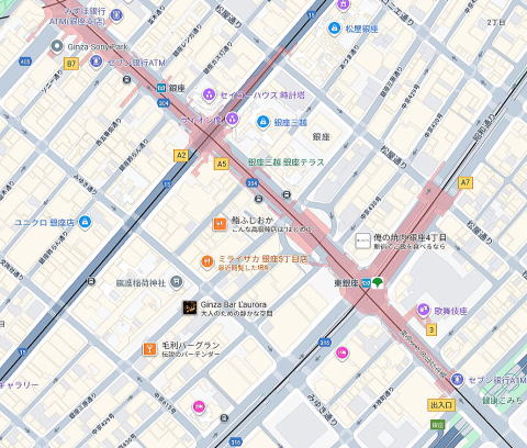 みゆき通りと銀座三原通りの角地、GINZA SIX隣接