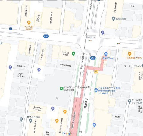 大久保通り沿い、大久保二丁目交差点そば、視認性良好