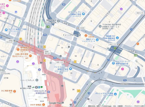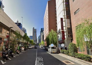駅至近、上階「銀座国際ホテル」、御門通り・見番通り角、博品館近く