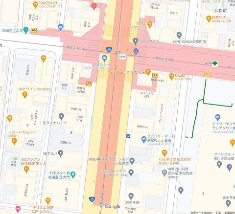 駅至近、第一京浜国道、大門交差点そば