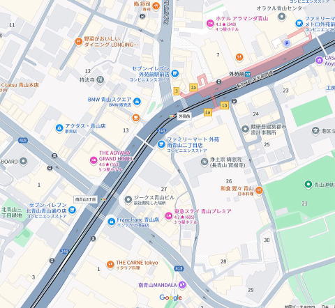 246号・外苑西通り角、南青山3丁目交差点角で視認性良好