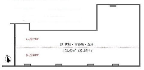 階数・面積 1階 32.86坪 (108.63㎡) *2分割可;A約18坪57.21万円、B約12坪33.17万円