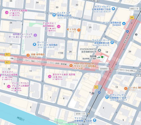 JR総武線の高架下立地、浅草橋駅東口横、周辺飲食店多数