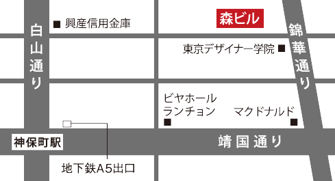 A5出口から左へ靖国通り沿いに駿河台下交差点方面へ進み、マクドナルドの先を左折して錦華通りを200mほど進むと、左手に「東京デザイナー学院」があります。その先の路地を左折して右手2件目のビルです。